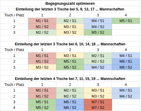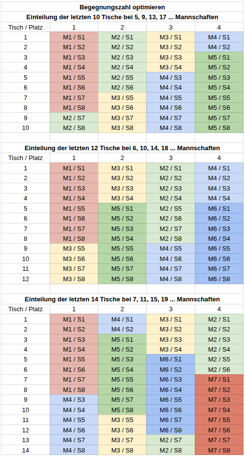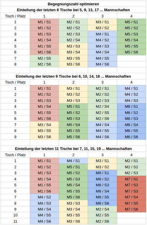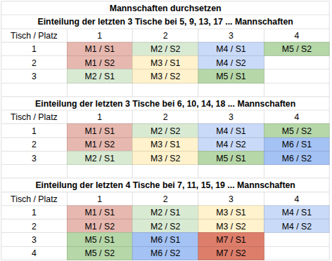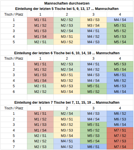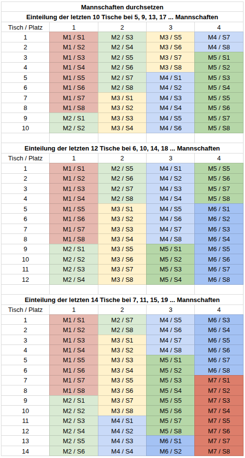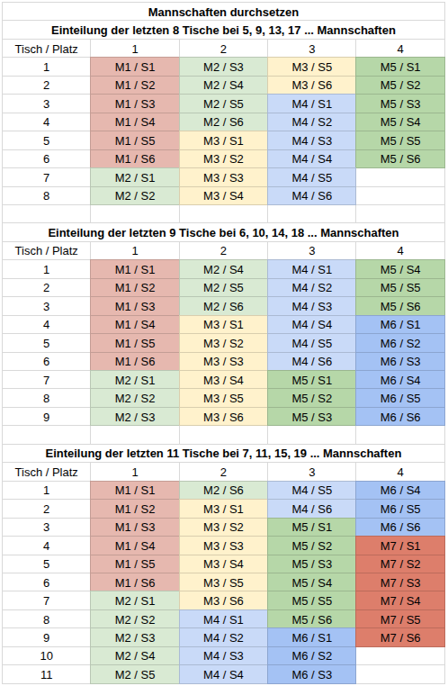 Die Unterschiede der Varianten schauen wir uns im Folgenden an. In den Grafiken sind vertikal die Tische im letzten Block und horizontal die Plätze am jeweiligen Tisch dargestellt. M1 ist die Mannschaft mit den meisten Punkten, M2 die Mannschaft mit den zweit meisten Punkten usw.. S1 ist der Spieler mit den meisten Punkten innerhalb der Mannschaft, S2 der Spieler mit den zweit meisten Punkten usw..